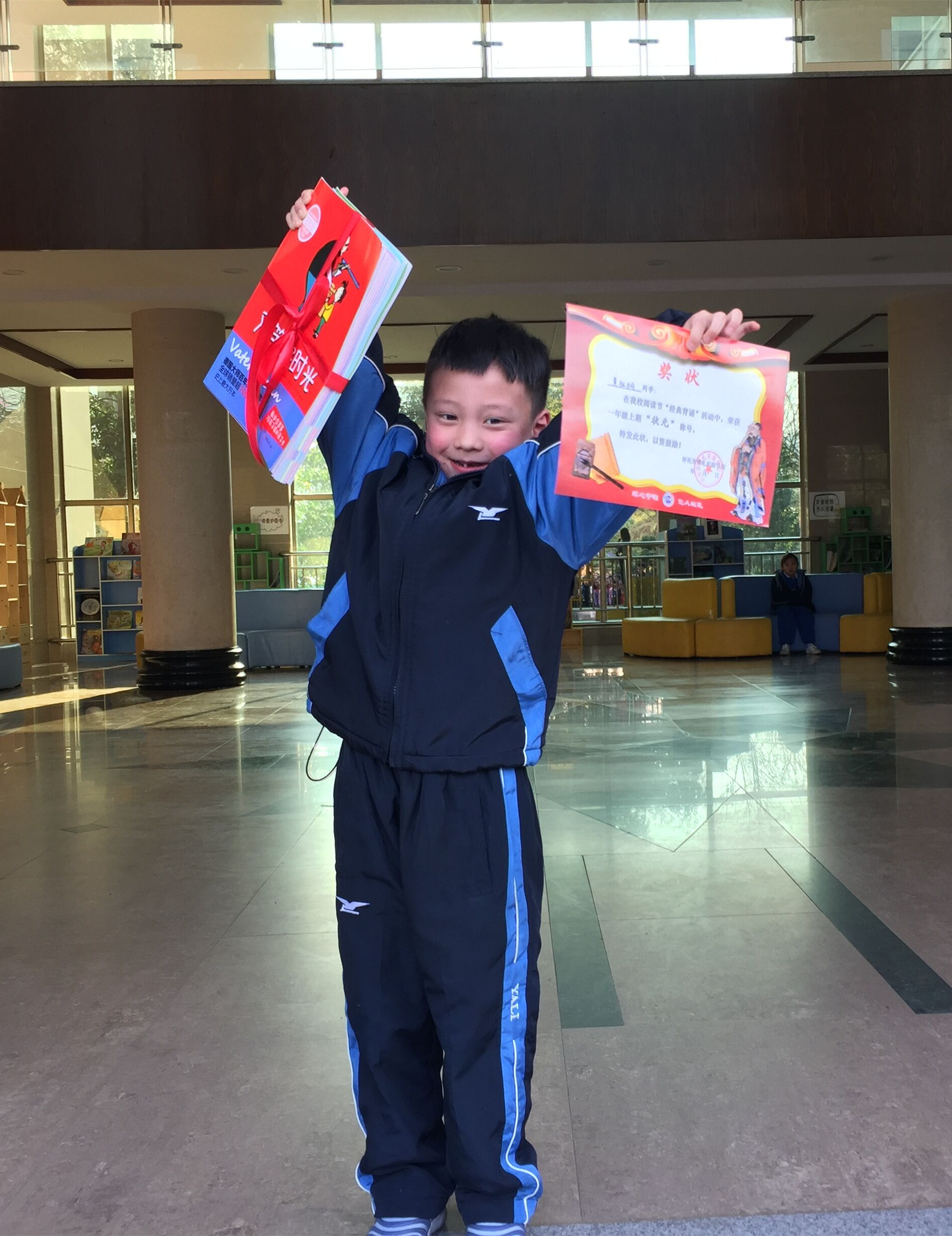 第一個頒發的獎項是“狀元”。一班黃祖桐小朋友和楊子恒小朋友通過寒假的不懈努力,完整背誦了67篇經典古詩詞及文章,也成為了光榮的小小狀元郎!他們興高采烈地走上頒獎臺,走到唐副校長身邊,有禮貌地雙手接過獎狀和學校為他們精心準備的獎品——《歡笑好時光》系列叢書并鞠躬致謝,同學們也為他們喝彩!恰好周四是黃祖桐同學的生日,這真是一份無與倫比的生日禮物!