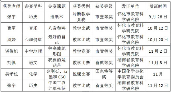 近兩個月來,我校老師頻頻取得佳績。張宇、曹軍、周婷、諶俊旭等老師在市級、省級各類教學比賽中均獲一等獎。