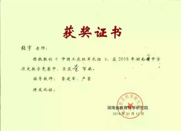 特大喜訊! 我校張宇老師榮獲湖南省2018年歷史教學競賽一等獎第一名