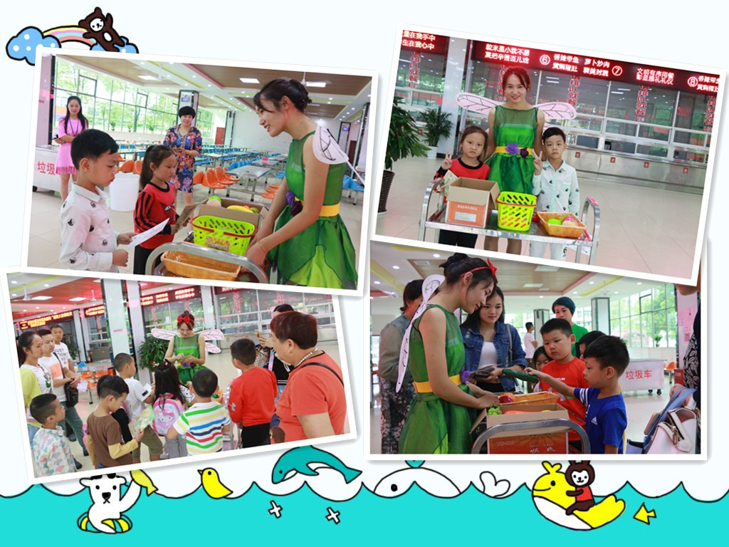 沿著干凈寬敞的校道,我們來到了學校餐廳,這兒有一位身穿綠裙的仙子——“蔬菜精靈”在等著我們呢。