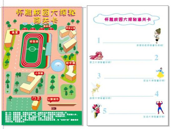 很快,我和我的小伙伴在分班榜上找到了自己的名字,開心地向教室走去。咚咚……“老師,我可以進(jìn)來嗎?”小朋友們順利地通過了“懷雅校園大探秘闖關(guān)的第一關(guān)”——找到自己的班級(jí)。此時(shí)活潑好動(dòng)的我們?nèi)粵]有了最開始的羞澀,立刻到班主任處報(bào)到并領(lǐng)取了懷雅校園大探秘闖關(guān)卡,班主任老師在闖關(guān)卡的第一關(guān)上蓋上可愛的闖關(guān)印章,隨后全身心投入到了愉快地校園闖關(guān)活動(dòng)中了。