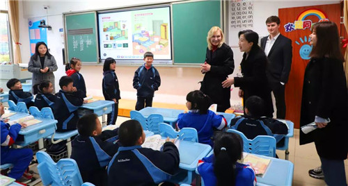 兩位學者觀摩我校小學部1803班英語課堂時,受到了孩子們熱烈的歡迎。孩子們紛紛主動問好,“Hi”、“how are you?”、“nice to meet you”......,兩位學者見到孩子們熱情地問好,親切地回應道“nice to meet you too”。面對這群活潑熱情的小家伙們,Barbara Fiedler不禁豎起了大拇指。