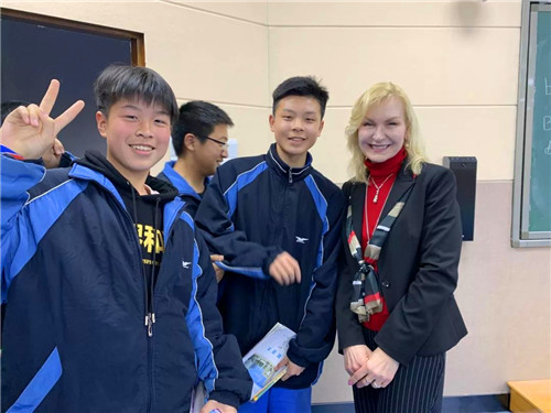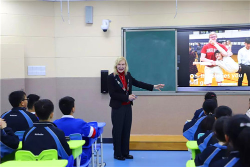 接著Barbara和Mat分別在中學部三樓及四樓錄播室進行了英美課堂展示與體驗。Barbara以“Why go to school in America?”(為什么去美國學校)為主題向同學們介紹了美國校園特色課堂文化,特色課外活動以及領導力課程。還談到了慈善活動,舞會,社團活動等等。同時Barbara作為一名有八年經驗的寄宿家庭媽媽,向學生介紹了寄宿在她家里的一名中國孩子和一名韓國孩子,以他們為例,向學生們展示了美國高中校園學習以及日常生活。