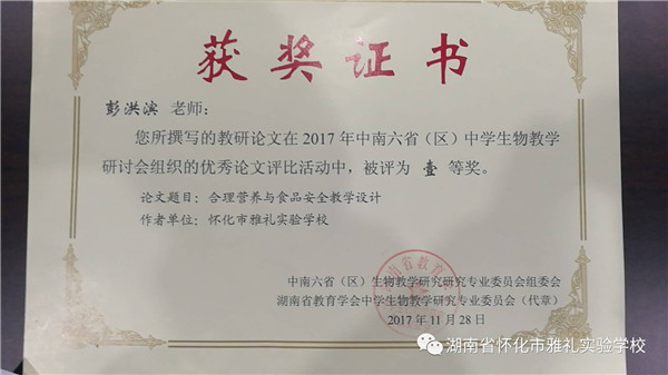 在2017年中南六省(區)中學生物教學研討會上,我校生物教師彭洪濱教學設計《合理營養與食品安全》榮獲一等獎(國家級),特向生物教研組和彭洪濱老師表示祝賀!