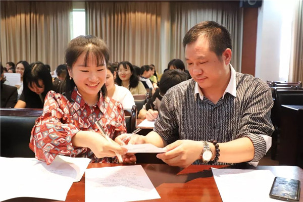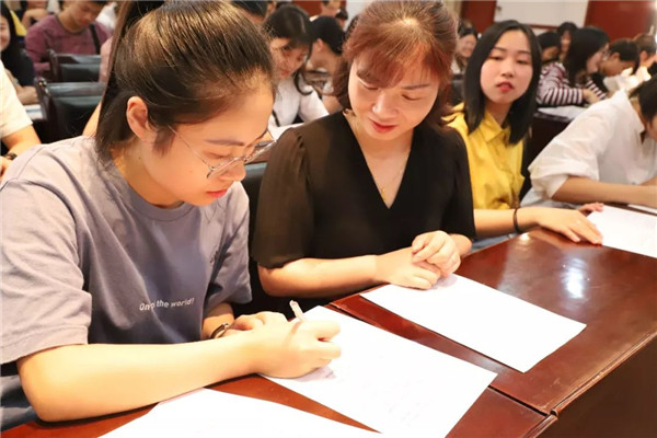 隨后,青年教師曾葉代表青方教師發言。她承諾勤學多問,及時總結,仔細研究教法,在學習師傅經驗的同時,注重與自身特點相結合,學以致用,多探索,多積累,盡快找到符合自身特色的教學思路和教學風格,爭取在最短的時間內使自己快速成長,早日出師。