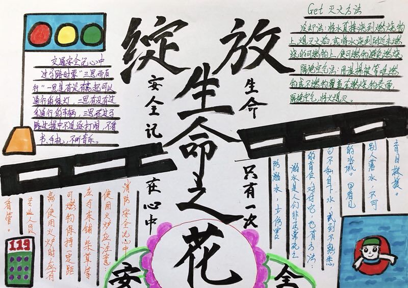 為了深化學校安全教育活動,用明麗的色彩和充滿活力熱情的圖案來激起同學們的安全意識,提高學生創新意識,創造能力和動手能力,學校還舉辦了以安全教育為主題的黑板報、手抄報、美術作品比賽。各班同學積極參與,認真準備,紛紛將自己對安全的認識繪畫成了立意新穎,創意獨特的精美作品。下面讓我們一起來欣賞一下吧。
