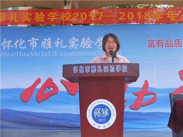 教師代表馬榕蔓老師作精彩發言。她說:同學們能取得喜人的成績,離不開我們在座的每一位老師的辛勤付出,我為能與這么一群優秀且樂于付出的同事共事而深感榮幸,為能在懷雅這樣一個積極向上,注重內涵發展,注重品質提升的大家庭工作、生活而驕傲。